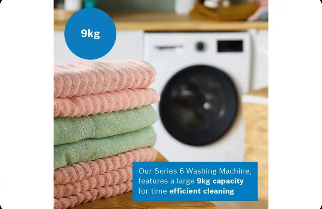 Bosch Series 6 9kg front-load washing machine  A energy rated for top efficiency and sustainability. Save energy and water while enjoying powerful cleaning with features like AntiStain (removes 4 common stains automatically), Speed Perfect (cuts cycle time up to 65%), Active Water Plus (adjusts water precisely, saves up to 50% on smaller loads), Hygiene Plus (kills 99.99% germs at 40°C), Iron Assist (reduces wrinkles via steam).