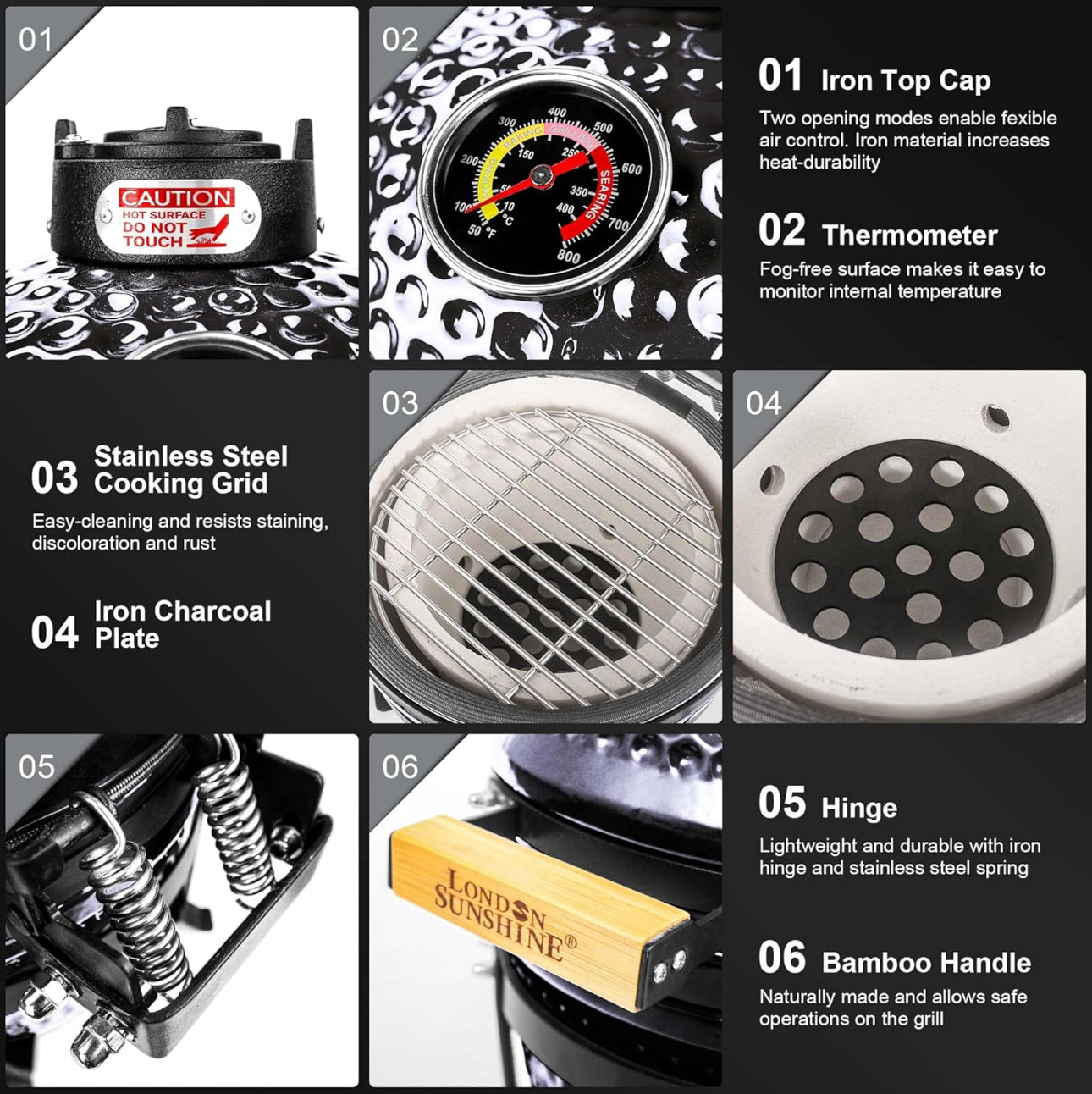 • DESIGNED with the griller in mind – Premium glass fiber gasket with thermometer, cast iron top vent, stainless steel bottom vent, inner fire bowl, iron charcoal grate, 11” easy clean stainless steel cooking grate.