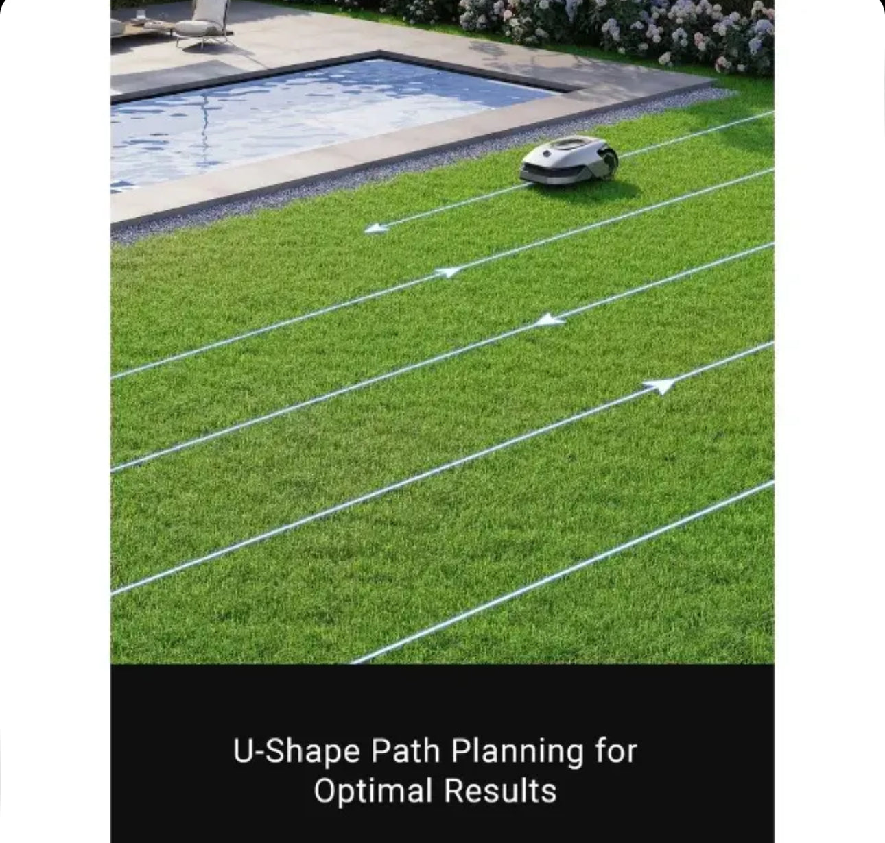 U-Shape Path Planning for Optimal Results – A1 works in an innovative U-shape path that thoroughly covers your lawn for impressive evenness and quality of cut. Spacious yards up to 1,000m² can be fully maintained in just 24 hours.