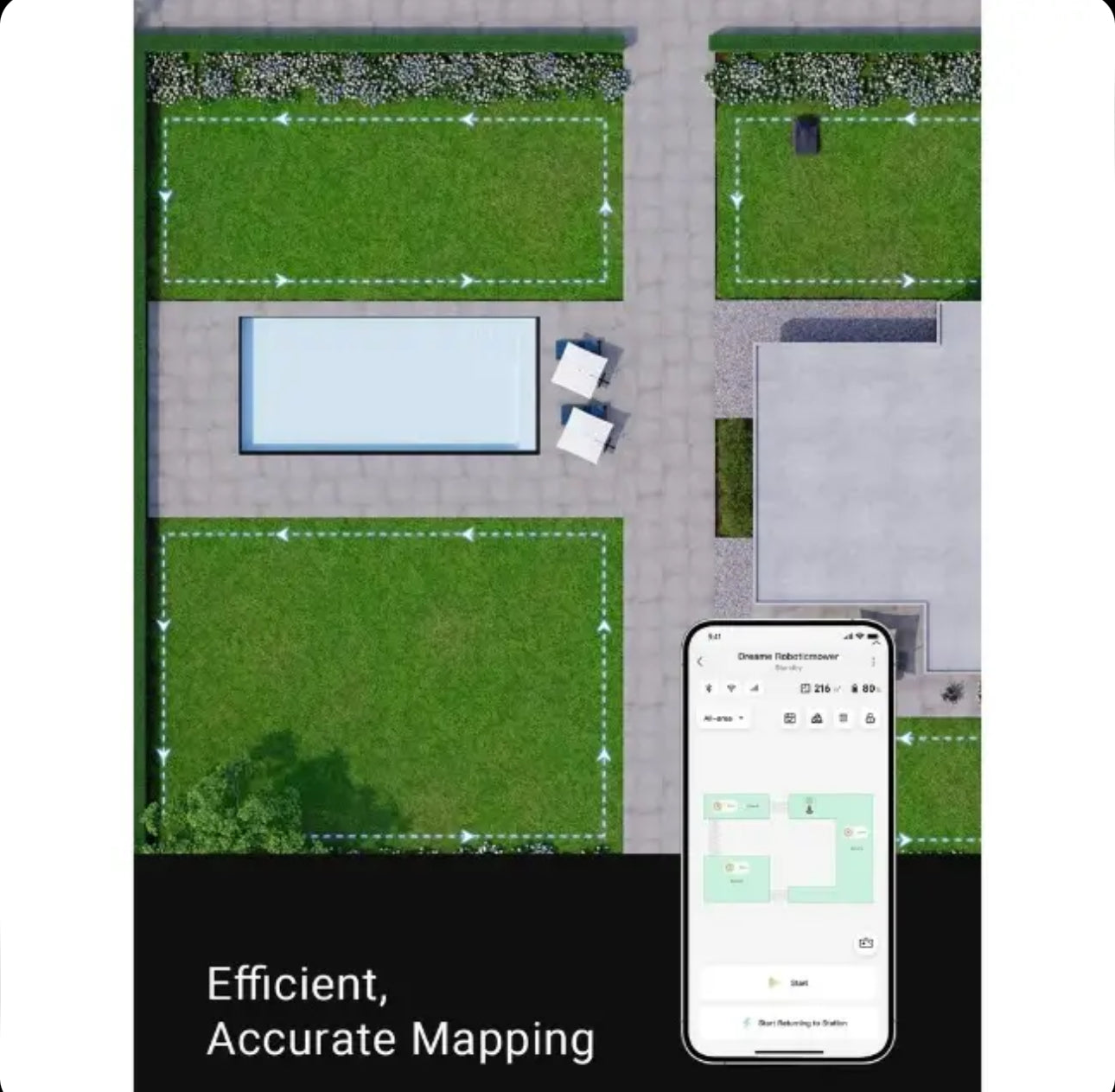 Smooth, Seamless Mowing – A1 recharges itself, freeing you from low battery anxiety. When power goes below 15%, this smart mower automatically returns to the charging station and then gets back to work after a full charge, making it especially ideal for large yards.