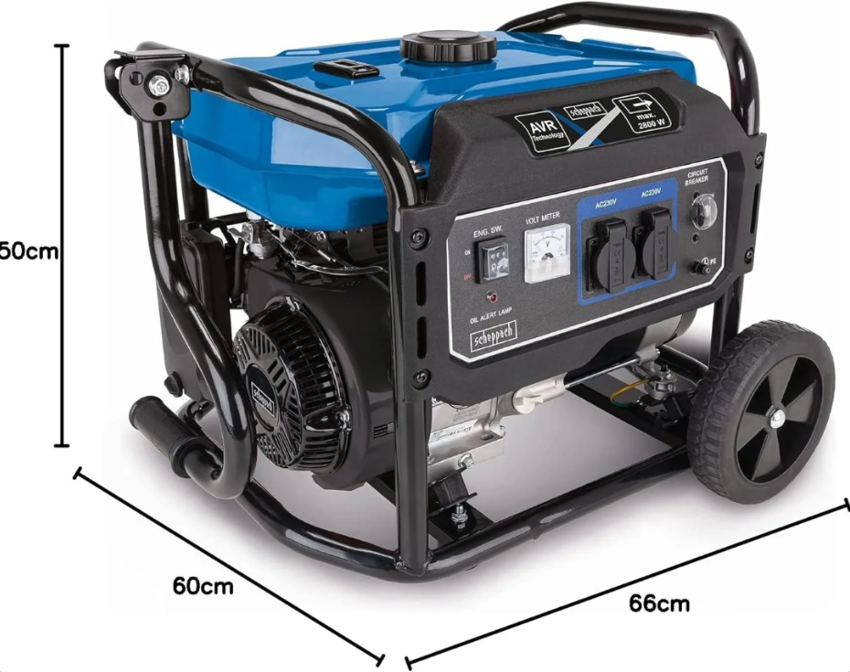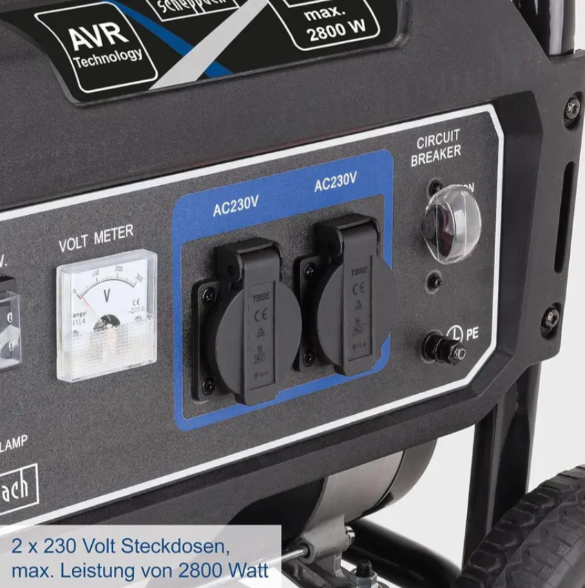 The Scheppach SG3200 is a portable generator designed to provide stable and safe power on construction sites, campsites, in home emergencies, or for outdoor activities. With a continuous output of 2.5 kW and a maximum output of 2.8 kW, it provides enough power to power power tools, household appliances, and electronic devices. The 4-stroke engine is robust and efficient, while its compact design and integrated wheels make it easy to transport.