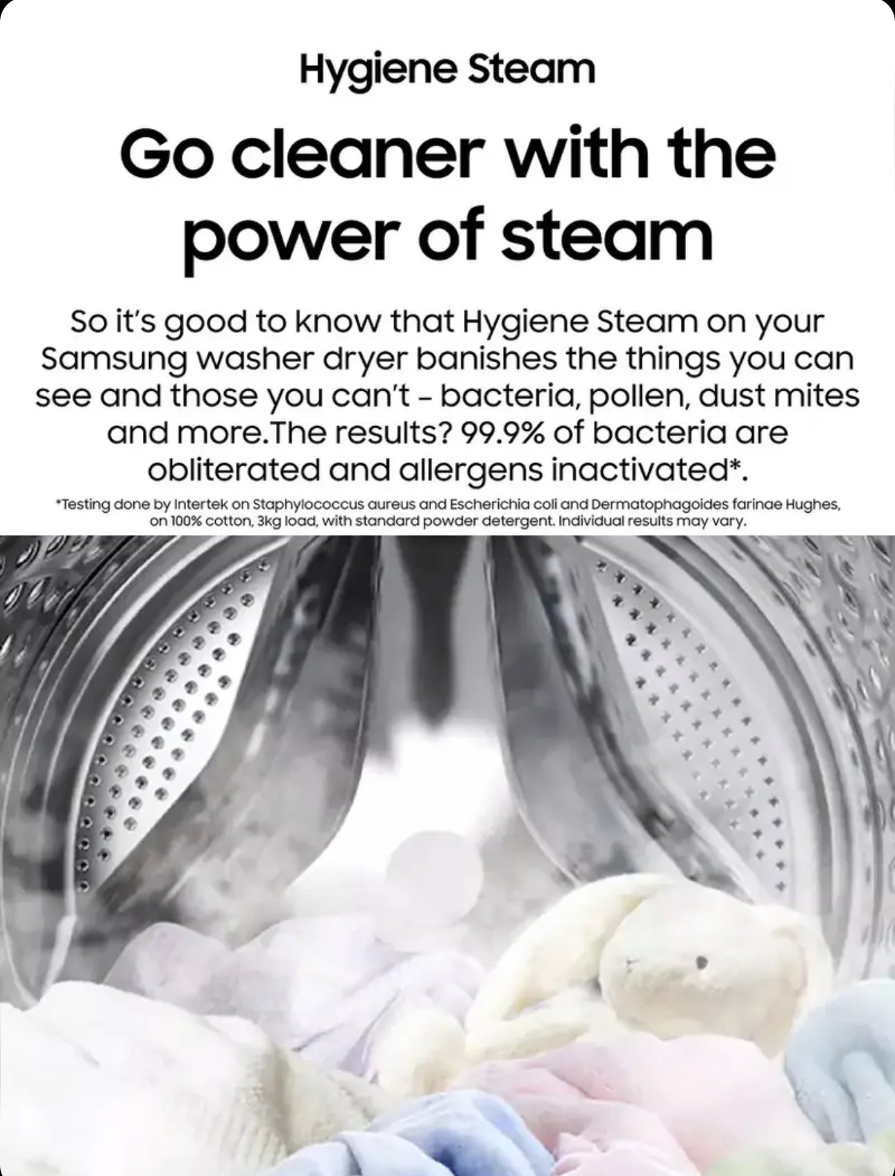 Banish more than just stains and odours. The Hygiene Steam cycle on your Samsung washer dryer releases hot steam, eliminating 99.9% of bacteria and inactivating allergens. (Testing done by Intertek on Staphylococcus aureus and Escherichia coli and Dermatophagoides farinae Hughes, on 100% cotton, 3kg load, with standard powder detergent.)