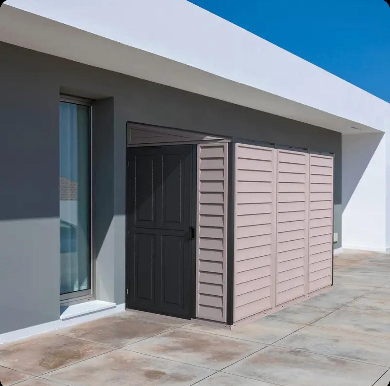 The Duramax SideMate 4×8 PLUS garden shed is the ideal choice for anyone looking for functional and durable storage space, perfect for placing next to the house or in tight spaces. Made of reinforced, weather-resistant plastic, it offers a durable and low-maintenance solution. Includes a metal foundation kit for stability and floor support.