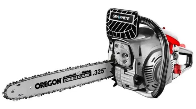 2.45 HP, 1800W Chainsaw The premium GRAPHITE petrol chainsaw (ref. 58G943) with a 1.8kW/2.45hp engine is designed for quick and convenient wood cutting. The saw's minimum speed is 2,800 rpm, and its maximum is 10,000 rpm. The device is equipped with an automatic brake, which stops the chain during cutting. A WALBRO diaphragm carburetor ensures proper fuel delivery, and a sturdy OREGON chain and guide bar ensure effective cutting. The two-point bar mounting and shock absorber system increase the machine's stability during operation. The saw is equipped with an integrated chain lubrication system, and there is also the option to manually adjust oil consumption. The crankshaft is mounted in an aluminum alloy housing, and the machine is also protected by a high-quality plastic cover with increased impact resistance. Additionally, the saw features full support for rotating parts and a two-point safety brake lever mount. Average fuel consumption is 0.85 l/h. The saw comes with a guide bar cover, guide bar, chain, pointed claw, gasoline oil mixture container, screwdriver, and assembly wrenches. CE certification ensures compliance with European standards.